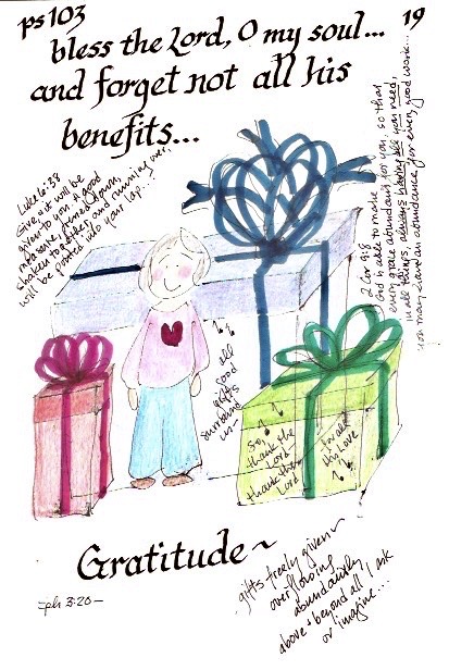 This recollection often brings tears to my eyes, even today when I related it to a friend.  The sense of God’s desire to bless me abundantly is revealed to me over and over again as I experience His Goodness in day to day living, and fills my heart with gratitude!  Yesterday He surprised me as I came from out of town to a conference of about 1000 people and walked in right next to a good pastor I’ve known for 20 years and had been hoping to see, and led me to a table where I turned around and found 8 ladies from a prayer group that were all so dear to my heart.  Hugs and smiles and joy flowed as we were all so delighted at the unexpected meeting!  Eph 3:20 comes to mind, “Now to him who is able to accomplish more than all we ask or imagine…”.