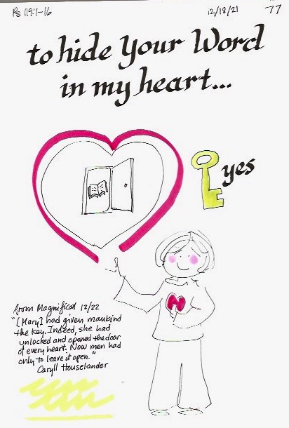 I had been finding it helpful to sketch the images that came to mind as I prayed, so I wrote “to hide Your Word in my heart…” and then sketched that image of the Bible, seen through the open door within my heart. Although it hadn’t come to mind in my prayer time, I outlined a large key next to the image of the heart, and I remember wondering why I had put the key there ~