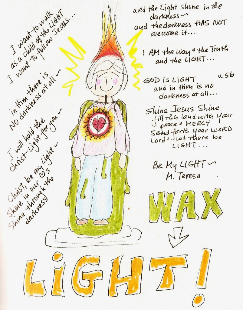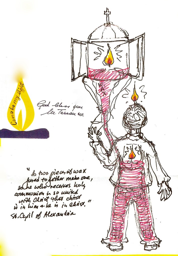 Lord God, thank You for the beautiful gifts You give to bring us healing and hope, encouragement and strength – and especially to remind us that You live within us, more and more with each reception of the Eucharist. May I be like that candle wax, slowly consumed to bring Your Light to the world I live in ~