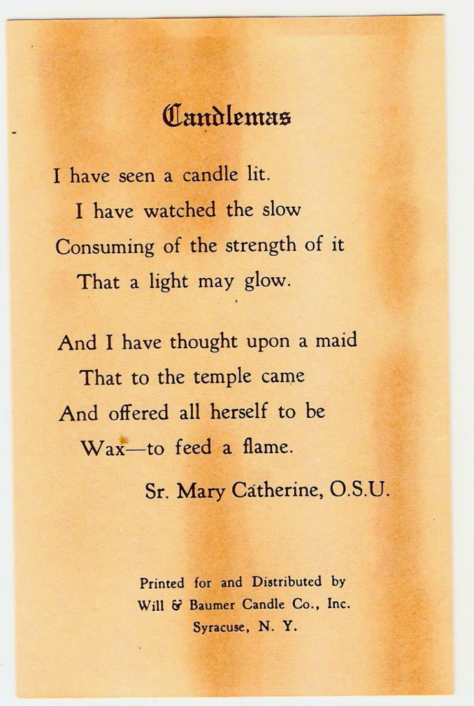 The holy card was dated 1949 ~ I had never heard of Our Lady of the Candles before. The card appeared, I don’t remember how, on the Feast of Candlemas, and shows Mary holding the baby Jesus aloft, as a flame of Light, with herself like a candle. It was very beautiful to me.