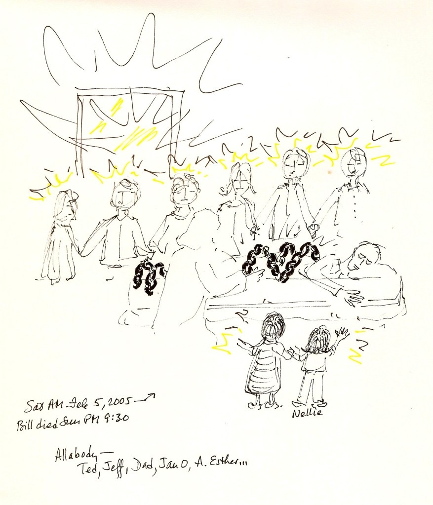 As I prayed, I began to visualize Bill’s bedroom where he had lain in bed much of the last several months, and almost exclusively these last few weeks. The room was very dark. I began to see the members of our family gathered in a circle around Bill’s bed, all holding hands and quietly praying for him – included in the circle were our older brother Ted who had died of a brain tumor in 1996, Bill’s son Jeff who had been killed by a drunk driver shor tly after his 18th birthday in 1982, his first wife Jan who had also died of cancer in 1999, and our dad who had died with Alzheimer’s in 1990. All of the living members of the family were there too, including the youngest, our granddaughter Nellie. She was standing close to Bill’s head, and she reached out her little hand, touched his forehead, and gave him a kiss. There was a luminescence around the people standing there, making a dim light in the otherwise dark room.