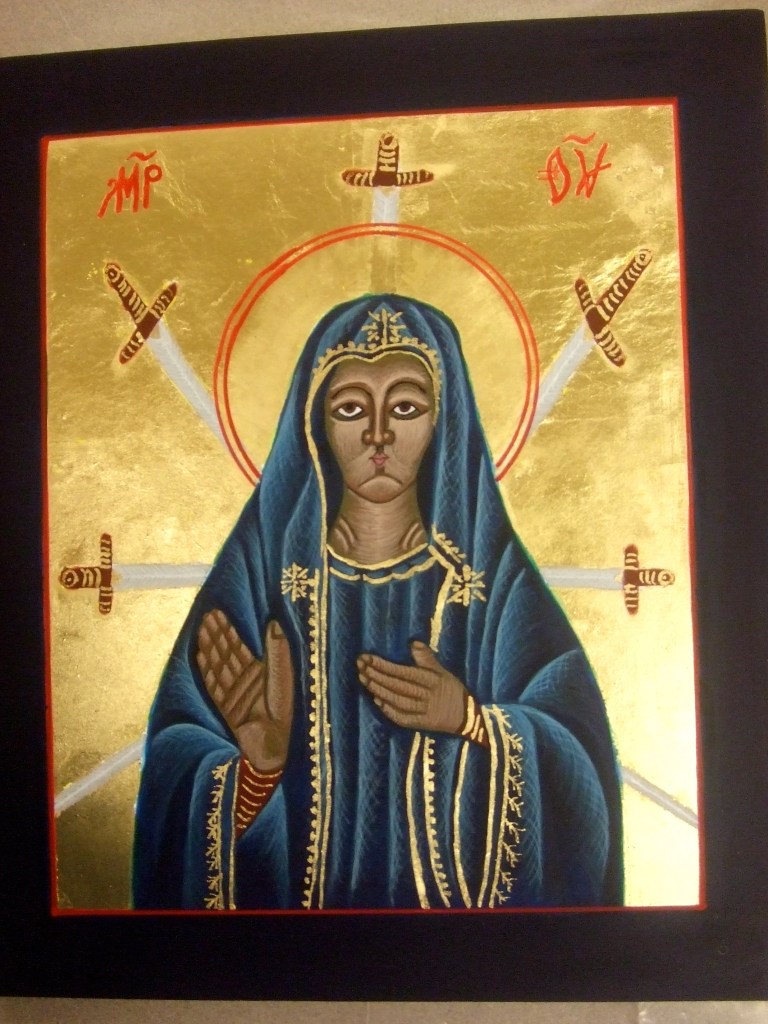 A second experience that comes to mind relates to Our Lady of Seven Sorrows. I was blessed to participate in an icon writing retreat on Chambers Island, and the icon we wrote depicted this mystery. For a whole week we were able to immerse ourselves in this image, skillfully led through the process by our teacher, Chris Thelen. Fr Tom was also participating in this retreat, and his presence to celebrate Mass for us, lead us in prayer, and join in the struggle and joy of writing an icon was another beautiful gift to all of us. The doubts we all experienced about being able to accomplish this task were replaced by amazement that we actually did it, encouraged and led step by step by Chris, and immersed in God’s grace on this holy ground. We began each session reciting the iconographer’s prayer, and were reminded to come back to it often throughout the process. At the end of the week, our icons were placed on the altar for our closing l iturgy and blessed by Fr Tom…
