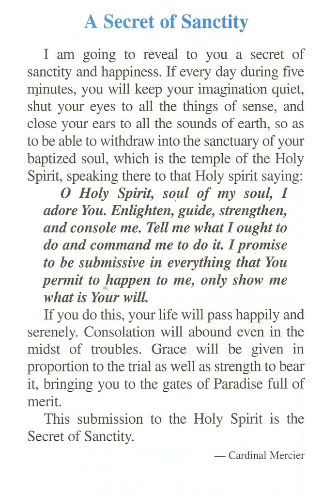 I could remember a simple formula like that, so first, I made a commitment to spend 15 minutes a day in prayer. Secondly, I had been teaching 3rd grade CCD, and the need came for a 7th grade teacher. I agreed, and found that the 7th grade curriculum centered on the life of Jesus. Third, a prayer to the Holy Spirit literally fell out of two different books at me! So I began to pray that prayer daily also.
