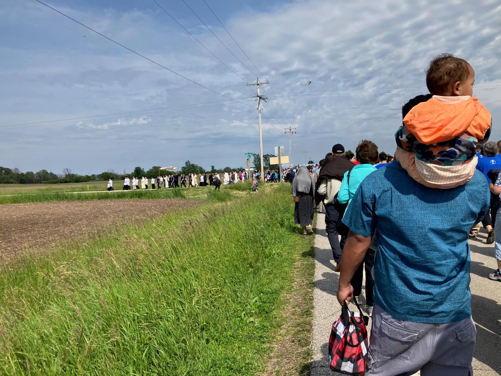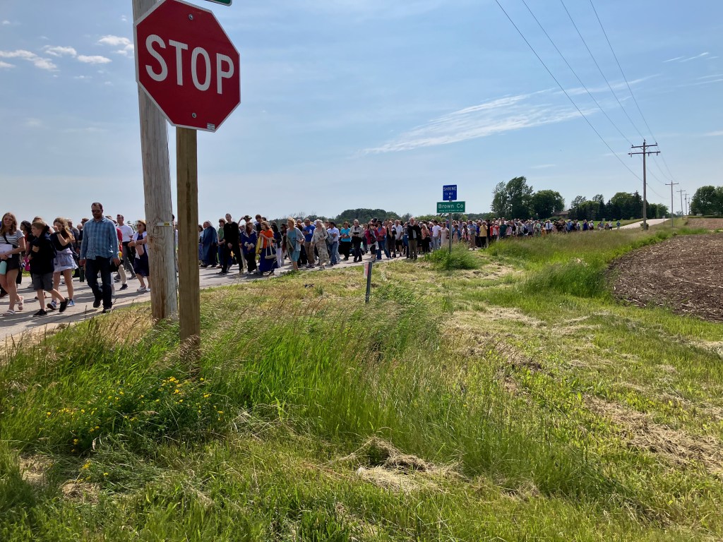 When I heard the procession would be passing through the Shrine of Our Lady of Champion, I knew that was the place I wanted to join in. Having been a volunteer there when it was first declared worthy of belief in 2010, and watching as it’s status continued to grow, it was dear to my heart. Driving there through the farmlands, with little or no traffic, and arriving at this place of peace was always a highlight and blessing! I was already planning a trip to WI for my great-niece’s graduation party, so the timing was perfect!